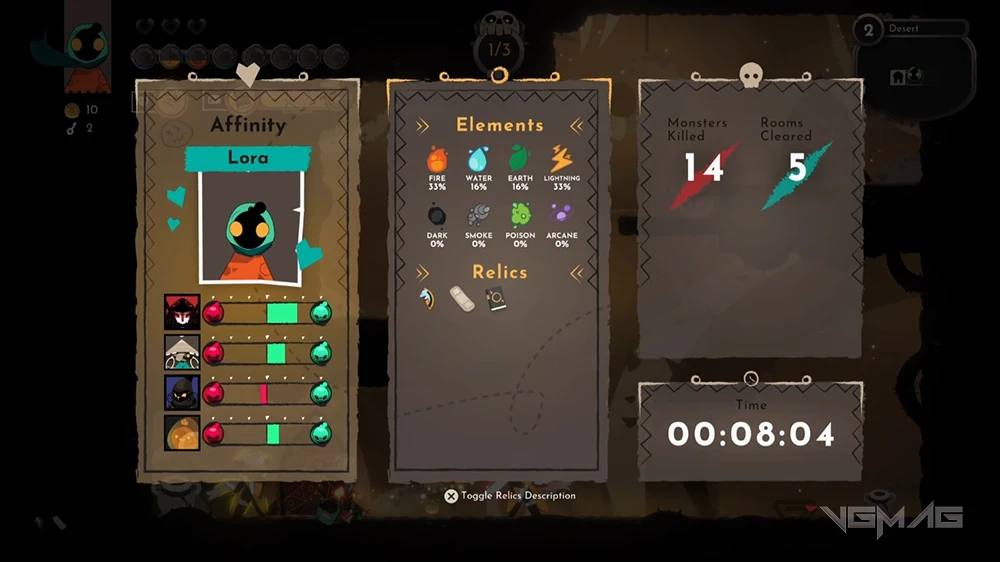 علاوه بر این، شما در هر دست Relicهایی دریافت میکنید که به شخصیت شما یک قابلیت ویژه یا یک حالت شلیک عجیب و گاهی خندهدار میدهند. مثلا شما ممکن است شانس بیاورید و یک عتیقه پیدا کنید که شلیک اصلی شما را تبدیل به اسکوپ بستنی میکند. یا یک عتیقه که با هر بار شلیک یک جادوگر کوچک معلق در هوا میسازد که به دشمنان شما شلیک میکند. بعضی از این Relicها، کار شما را آسانتر میکنند، ولی بعضی از آنها شما را مجبور میکنند تا استراتژی و تاکتیک خود را تغییر دهید.